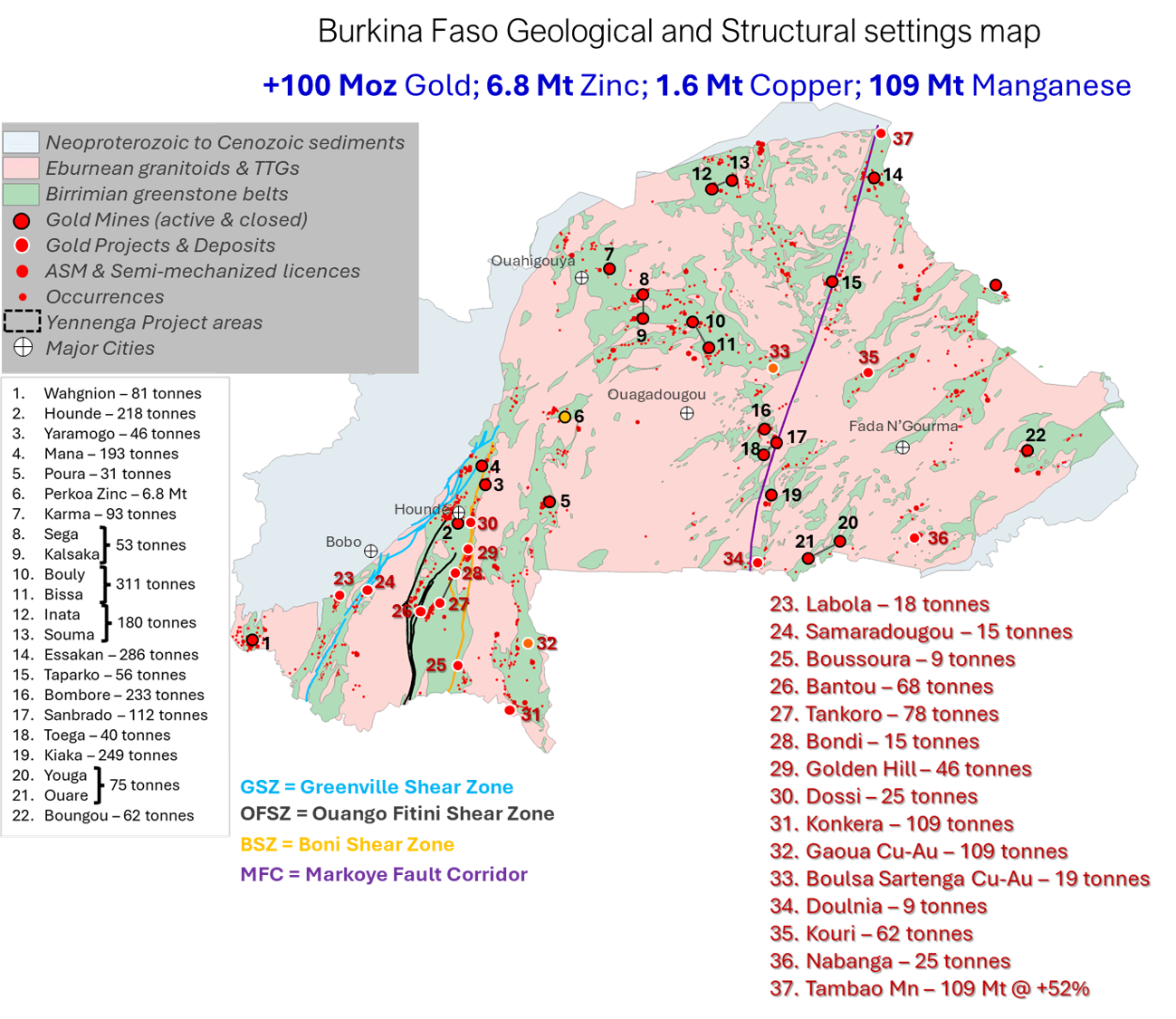 +100 Moz gold endowment with more than ten producing gold mines from world class deposits located in the prolific Greenstone belts such as the Hounde and Boromo belts and the Markoye Fault. Several international mining compagnies such as Endeavour Mining, Iamgold, West African Resources, Fortuna Silver, Orezone Resources operate in the country. The Mining Cadastre is still closed to new applications. However Yennenga Resources has prepared several applications ready to be submitted when the Cadastre is open.